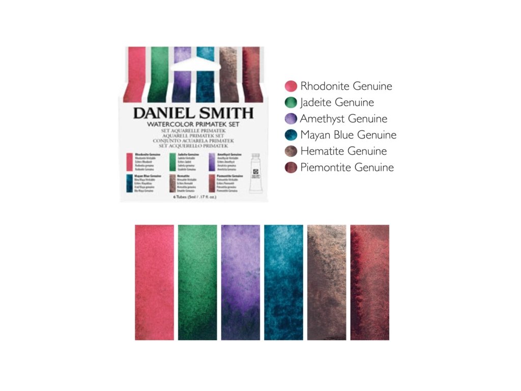 Sada akvarelových barev Daniel Smith - Primatek. Barvy jsou v tubách po 5ml a jsou vyrobeny z přírodních minerálů. Barvy mají velmi vysokou pigmentaci a kvalitu barev, jedná se o jedny z nejoblíbenějších barev na světě mezi profesionály. Várky barev bývají v procesu výroby důkladně testovány, aby byly správně světlostálé a čisté. Vyrábějí se od roku 1993 v Seattlu.