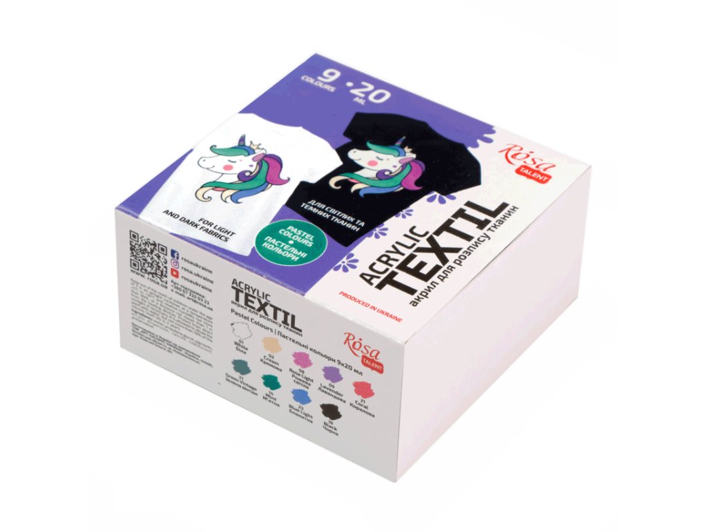 Barvy na textil Rosa Unicorn založené na akrylové bázi. Jsou vysoce krycí a zachovávají si své výrazné barvy i po zaschnutí. Vhodné pro světlý i tmavý textil. Barva se vpije přímo do látky, aniž by vytvořila tvrdý film na povrchu. Obsahují krásné, jemné pastelové odstíny.