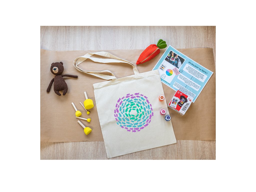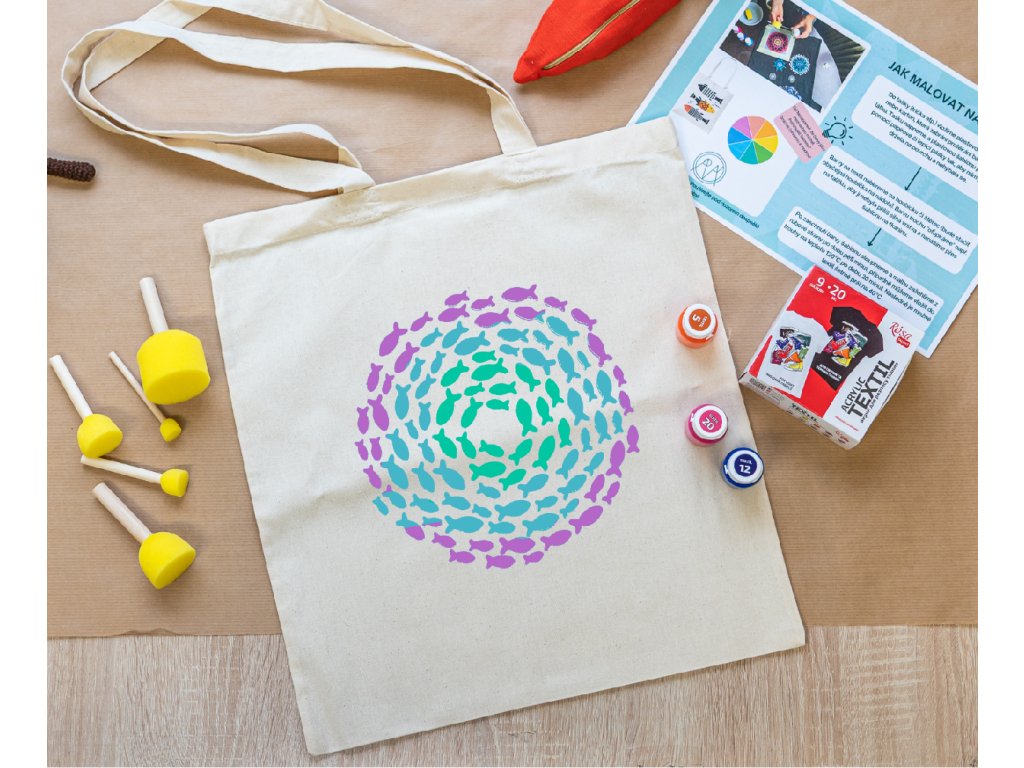 Sada pro malování na textil - 3x bavlněná taška bez potisku, 9x barvy na textil, 1x šablona hejna rybiček, tupovací houbičky