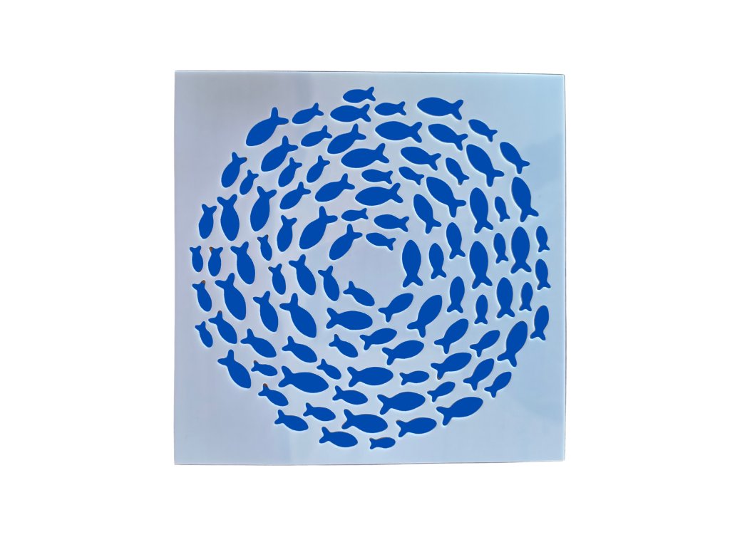 V sadě je přiložena i plastová šablona hejna rybiček pro ty, kteří si netroufají malovat jen tak od ruky. Rozměry šablony jsou 15x15 cm. Můžete ji opakovaně použít i k malování na papír, stěnu a další materiály.
