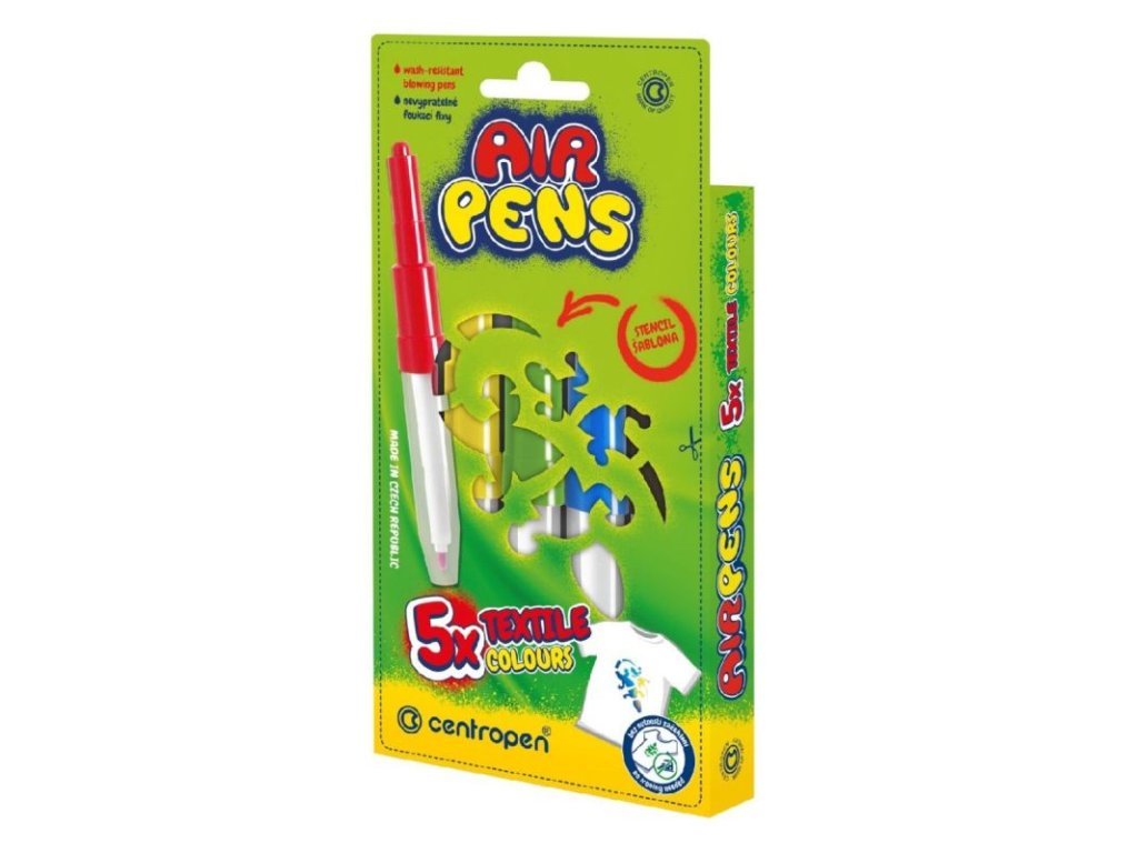 Balení foukacích fixů na textil značky Centropen s 5 základními odstíny jsou odolné pro praní do 60°C a jsou vhodné i pro malé děti. Na jejich obalu navíc naleznete další použitelnou šablonu s motivem ještěrky/gekona.