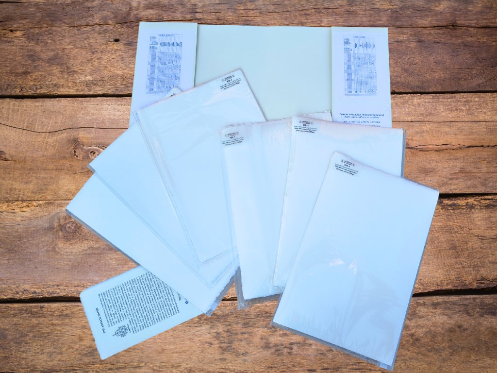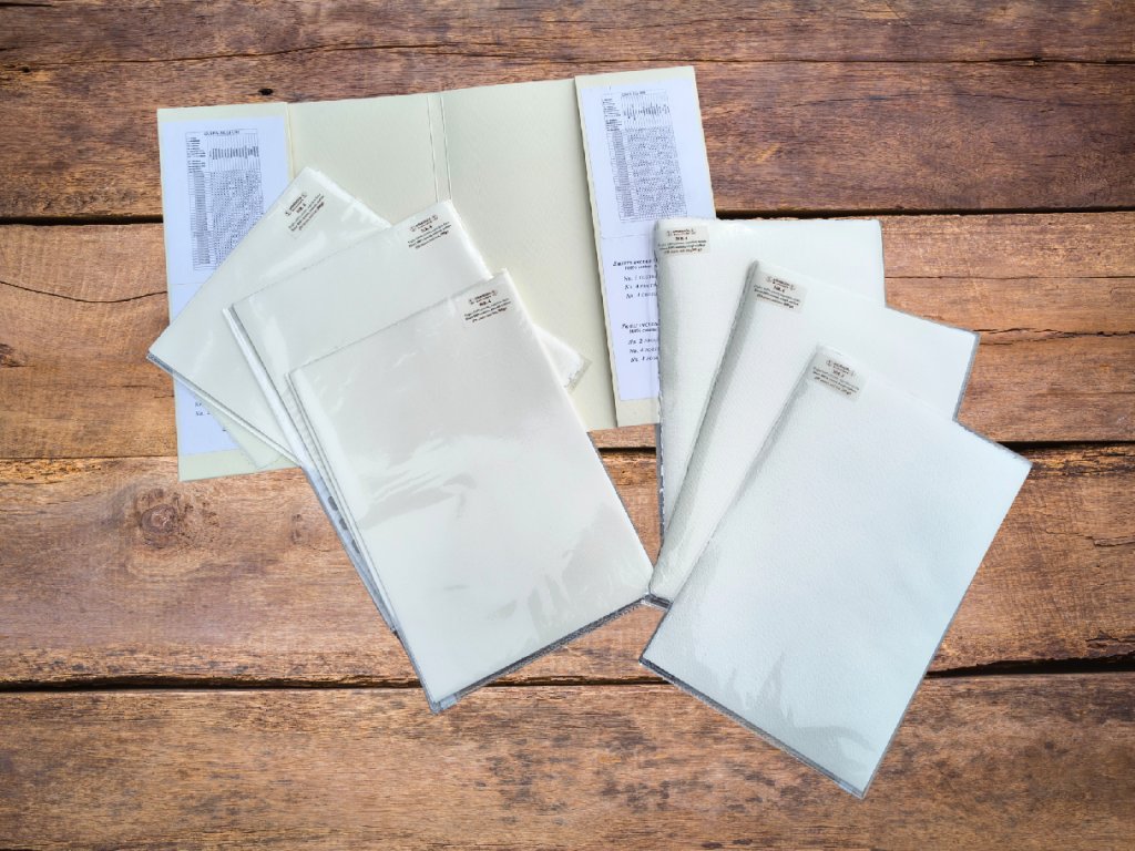 Složka obsahuje výběr 20 bavlněných archů o formátu A4, najdeme v ní 10 papírů s hladkým povrchem (CP), vhodným i pro malbu detailů či kaligrafii a 10 papírů s povrchem Rough, kde se při výrobě používají plstěné pláty s výraznější texturou. Pro každý povrch je přiloženo 10 kusů papíru o různých gramážích, 2x150g, 2x2OOg, 2x250g, 2x300g a 2x500g na metr čtvereční. Čím vyšší gramáž, tím víc vody můžeme při malbě akvarelem použít. Každý typ gramáže je vložen do kódovaného, celofánovaného sáčku pro uchování a snadné rozpoznání.