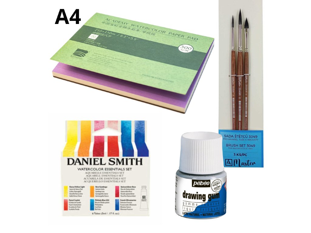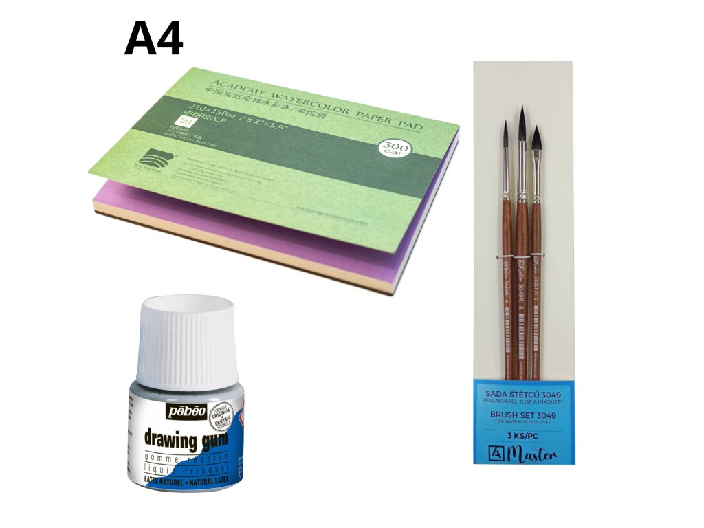 Sada základních akvarelových pomůcek - štětce, krycí guma, bavlněný blok, volitelně barvy
