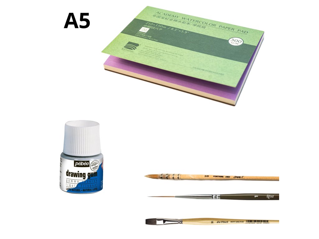 Sada základních akvarelových pomůcek - štětce, krycí guma, bavlněný blok, volitelně barvy