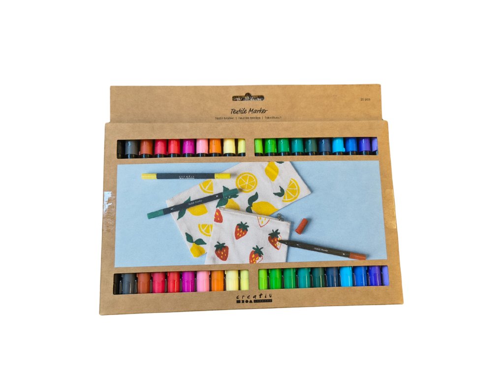 Velká sada dvouhrotých textilních fixů se širokou škálou odstínů. Dva typy hrotů umožní malovat tenké i širší stopy. Po domalování nechejte 6 hodin zaschnout a zažehlujte z rubové strany po dobu 5 minut na bavlnu. Vhodné pro tvoření s dětmi.